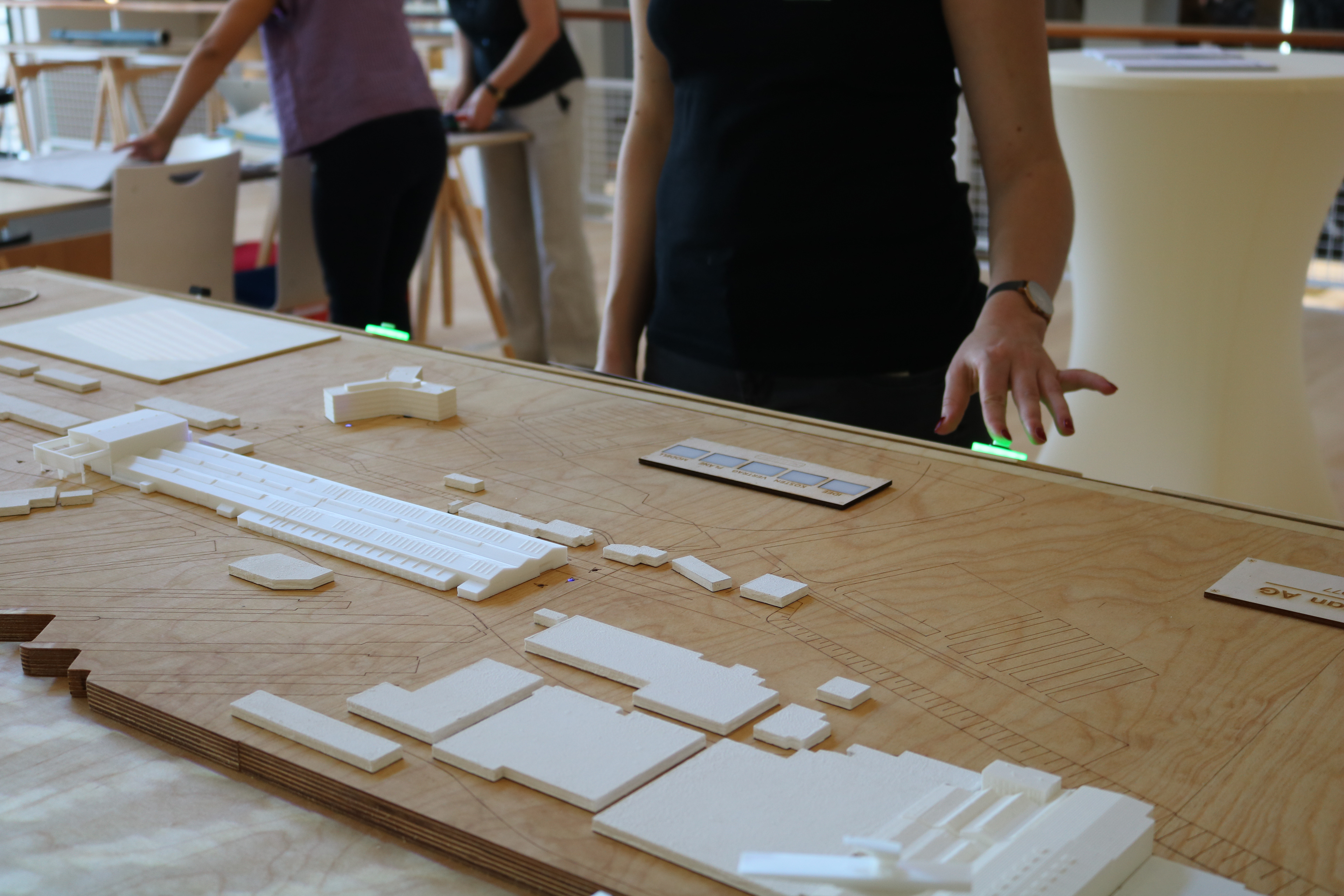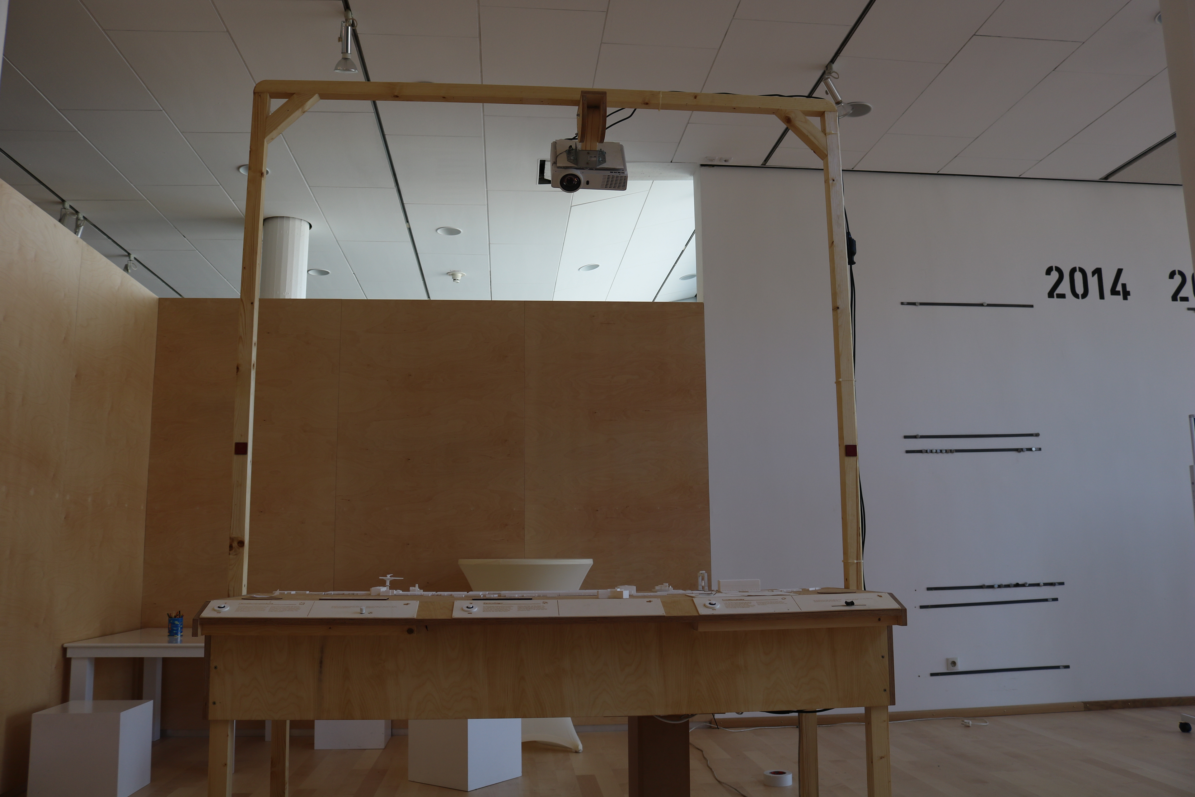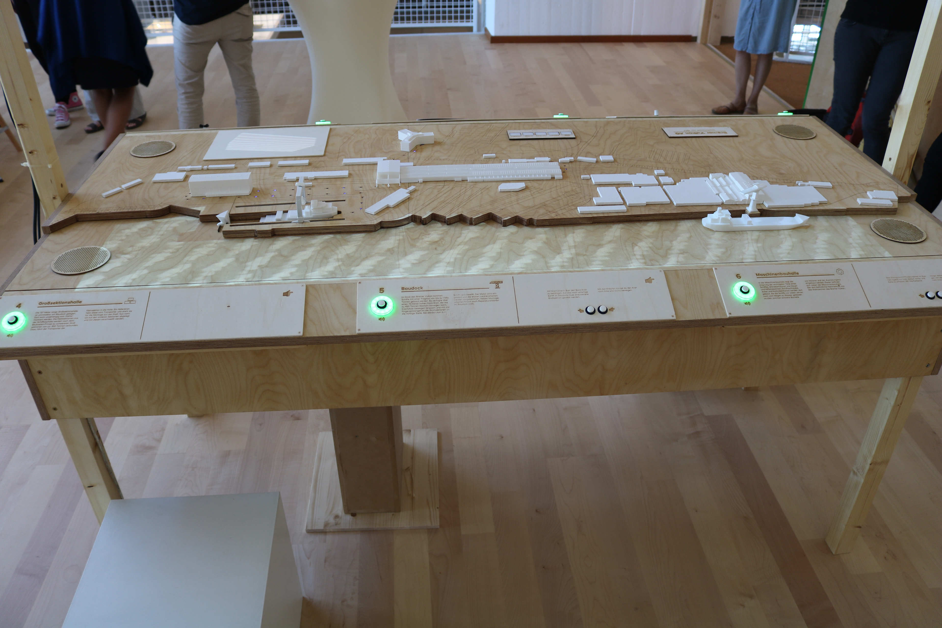The shipyard model was built based on info graphics from 1977. A CNC and lasercut machine brought them into the right form, the individual buildings, buttons etc. were modeled in Blender and then printed with a 3D printer. The buttons are connected to an Arduino micro controller that communicates with a Unity3D application. When pressing a button, the corresponding audio file starts explaining what‘s being built in this section and an animation, that gets projected onto the table, starts playing to visualize the corresponding concepts. The animations are played in Unity and cast onto the table with a projector from above.
